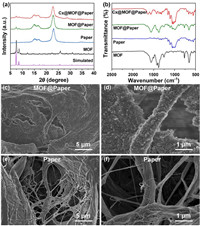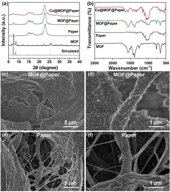 | Fig. 1. (a) PXRD patterns of Cx@MOF@Paper, MOF@Paper, Paper, MOF powder and simulated MOF. (b) ATR-FTIR spectra of Cx@MOF@Paper, MOF@Paper, Paper and MOF. SEM images of (c, d) MOF@Paper and (e, f) Paper. | |