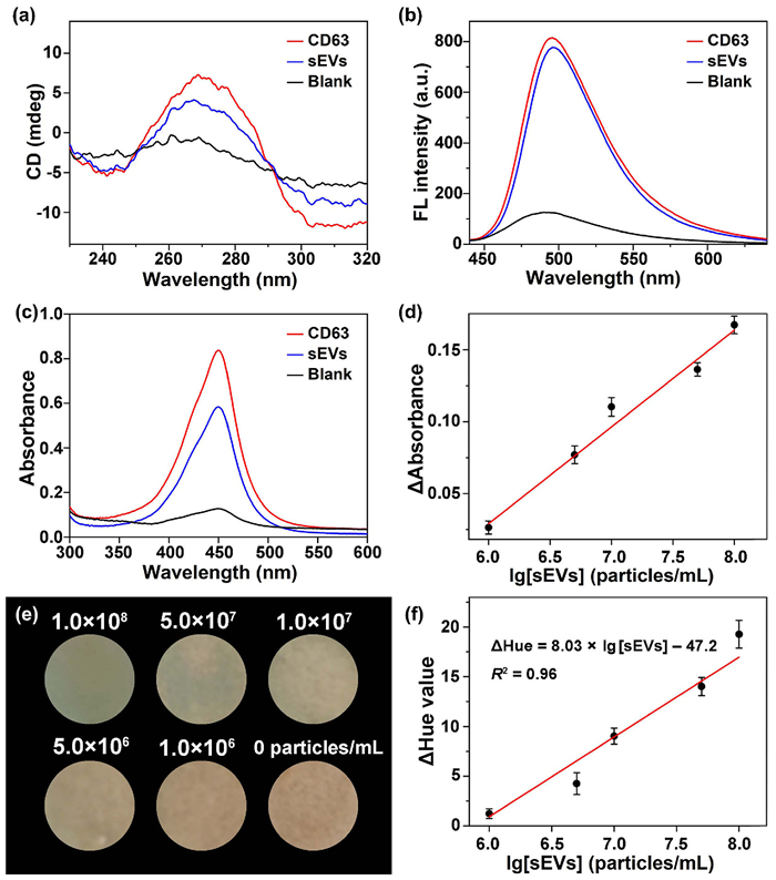 | Fig. 2. (a) CD spectrum, (b) fluorescence spectrum and (c) UV–vis absorption spectrum of control and the reaction of DP with CD63 and sEVs. (d) Plot of ΔAbs. vs. lg[sEVs]. (e) Pictures of DP reacts with various concentrations of sEVs on C1@MOF@Paper. (f) Plot of ΔHue vs. lg[sEVs]. | |