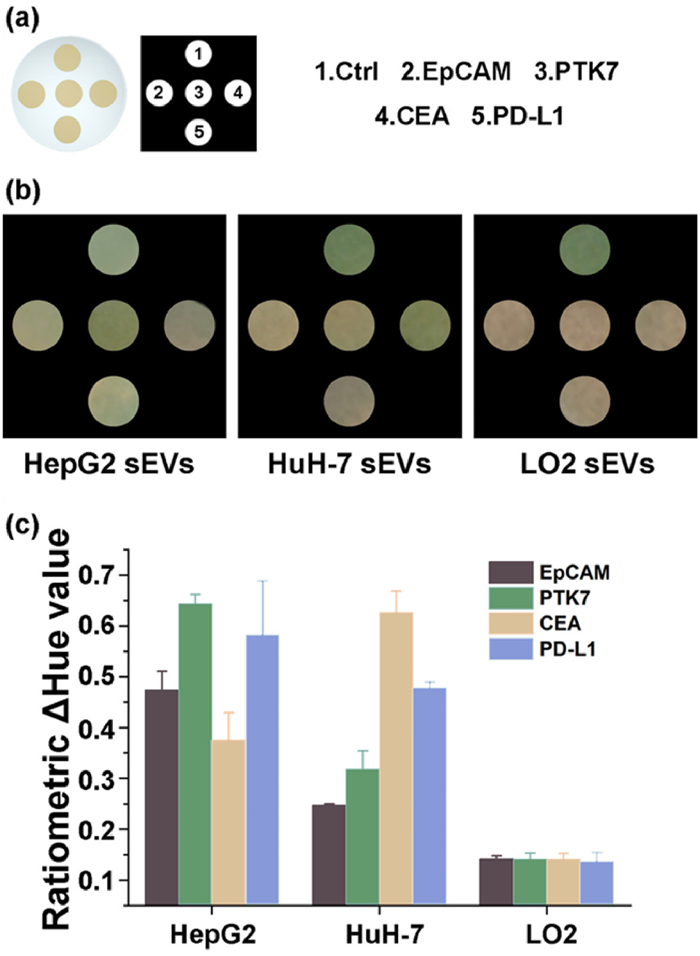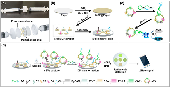 | Fig. 3. (a) Schematic diagram of assembly of multichannel chip. (b) Colorimetric results of different types of sEVs combined with DP on multichannel chips. (c) Ratiometric ΔHue value obtained from (b). | |