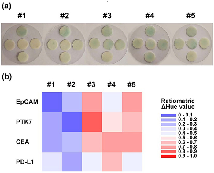After demonstrating the feasibility of sEV isolation and sEVpp detection of the sEVpp-PAD, the clinical applicability of this device was further verified. The sera samples obtained from people were directly introduced into the device using syringes, followed by the capture, washing and chromogenic reaction process as mentioned above. This study was approved by the Ethics Committee of the Seventh Affiliated Hospital, Sun Yat-sen University (KY-2024-221-01). Written informed consent was obtained from all patients. A total of 5 sera samples were detected, including samples from 2 healthy individuals (#1 and #2) and 3 hepatocellular carcinoma patients (#3, #4, and #5). The sEVs in these sera samples were captured and detected by similar processes in the above section. The photos of the multichannel chips are shown in Fig. 4a, and the ΔHue values are calculated and shown in Fig. 4b. It shows that the all the four sEV membrane proteins of the healthy individuals (#1 and #2) are with relatively low expression level, which is consistent with that of sEV obtained from LO2 cell culture medium, indicating a highly possible LO2 cell subtype for sample #1 and #2. For sample #4, its sEV membrane protein profile was CEA > PD-L1 > PDK7 > EpCAM, which is consistent with that of sEV obtained from HuH-7 cell culture medium, indicating that sample #4 was highly possible to be HuH-7 cell subtype. For sample #3, its sEV membrane protein expression was PTK7 ≫ EpCAM ≈ CEA > PD-L1, while that for sample #5 was EpCAM ≈ CEA > PTK7 > PD-L1. This profile was not similar to those cell subtypes we have measure, so sample #3 and #5 may belong to other cell subtypes rather than HepG2 or HuH-7. In the future works, we will obtain more samples and conduct the exosome subtyping by our device and standard method, and the in depth comparison and investigation will better verify the applicability of the proposed device. In general, this sEVpp-PAD holds great promise for the non-invasive diagnosis and subtype classification of cancer.