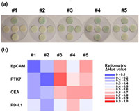 | Fig. 4. (a) Pictures of multichannel chip for the sEVpp detection of sera samples. (b) Heatmap of sEV membrane protein expression in sera samples. | |