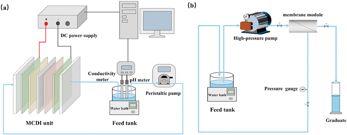 | Fig. 1. Schematic diagram of the (a) MCDI cell and (b) RO system. | |