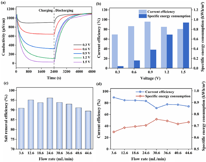 | Fig. 2. Variation of (a) feedwater conductivity and (b) specific energy consumption and current efficiency in MCDI with voltages changed. (c) Salt removal efficiency and (d) specific energy consumption and current efficiency for different flow rates. | |