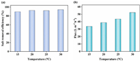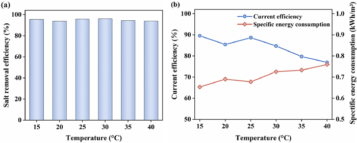| Fig. 3. Variation of the (a) salt removal efficiency, (b) specific energy consumption and current efficiency in MCDI when feedwater temperatures changed from 15 ℃ to 40 ℃. | |