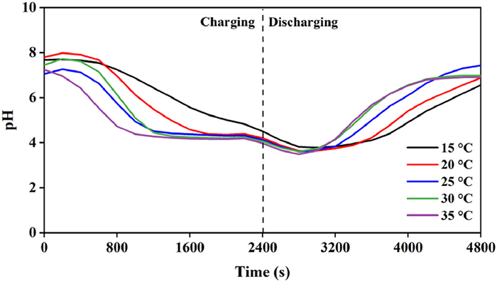 On the other hand, Yu et al. [34] analyzed the higher Li+ recovery capacity in an LMO/NiHCF cell at higher temperatures from a kinetic aspect and illustrated that with increasing temperature from 20 ℃ to 60 ℃, the ion transfer resistance in source solutions declined, and the reaction constant of lithium embedded in LMO and the diffusion coefficient of lithium increased, resulting in lower overvoltage and higher discharge voltage [35]. Therefore, we can reasonably speculate that the increase in temperature may decrease the charge transfer resistance and improve H+ diffusion in the feedwater, leading to a higher electron transfer and hydrogen ion diffusion rate, which can promote anodic Faradaic reactions (Eqs. 4 and 5). As a result, feedwater pH fluctuations become severe with the increase of temperature.
