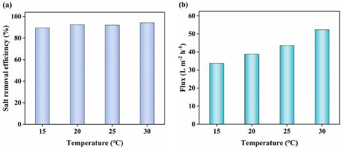 We further compared the performance of the RO system operating at different temperatures (15, 20, 25, and 30 ℃). As shown in Fig. 5, salt rejection efficiency increased slightly from 89.5% to 94.2% with rising temperature (Fig. 5a), indicating a minimal impact of feedwater temperature on salt rejection. However, we observed a significant impact of feedwater temperature on the RO productivity. At 15 ℃, the productivity was 33.68 L m‒2 h‒1, but it rose to 52.33 L m‒2 h‒1 when the temperature was elevated to 30 ℃, representing a 35.6% increase (Fig. 5b). Consequently, the energy consumption of the RO system will significantly increase when processing feedwater at lower temperatures due to the substantial decrease in productivity. The details are displayed in Table S1 (Supporting information).