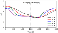 The pH variation of feedwater caused by various temperatures is shown in Fig. 4. The pH value of the feedwater in the MCDI operated under different temperatures decreased to around 4 during charging processes, but increased to the original value during the discharging processes. It should also be noticed that higher feedwater temperature induced a faster pH decline rate. The results are similar to the pH variation in CDI operated under the same conditions except that the initial rate of pH decline is fast in CDI and can be explained by Faradaic reactions, which are the main cause of pH change compared with non-Faradaic reactions [30]. Faradaic reactions are commonly known as anodic oxidation reactions generating H+ (Eqs. 1-3) and cathodic reduction reactions consuming H+ (Eqs. 4-6) [31]. At the applied voltage we used, the anode Faradaic reactions containing water hydrolysis (Eq. 4) and anode carbon oxidation (Eq. 5) are the major reactions that occur in the MCDI cell. After H+ was generated in the anode chamber, it passed the anion exchange membrane (AEM) and moved to the spacer, causing the pH value of the feedwater to decrease. It is worth noting that the movement could be influenced by electrostatic repulsion effects, resulting in a slower pH decrease compared to that in CDI cells [32].