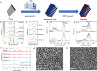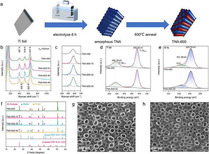 | Fig. 1. Synthesis and characterization of TNAs. (a) Synthesis strategy of TNA-450 and TNA-600. (b, c) Raman spectra. (d, e) XPS spectra of Ti 2p and O 1s for TNA-450 and TNA-600–30. (f) XRD Pattern of TNAs. (g, h) SEM image of TNA-450 and TNA-600–30. | |