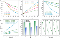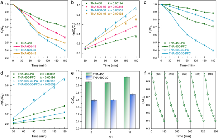 | Fig. 2. (a) Degradation efficiency of SMR by different TNAs photoanodes in PFC system (C0 = 10 mg/L). (b) Pseudo-first-order kinetics curve of different TNAs photoanodes in PFC system. (c) Degradation efficiency of SMR by two kinds of photoanode in different systems (C0 = 10 mg/L). (d) Pseudo-first-order kinetics curve of different TNAs photoanode in different systems. (e) Effect of initial solution pH on SMR degradation. (f) The degradation efficiency of SMR by TNA-600–30 for 5 cycles. | |
