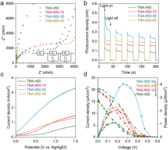 | Fig. 3. (a) Nyquist plots, (b) transient photocurrent curves of TNA-450 and TNA-600. (c) LSV curves of TNA-450 and TNA-600 under illumination. (d) J-V curves and corresponding power densities of PFC based on TNA-450 and TNA-600. | |