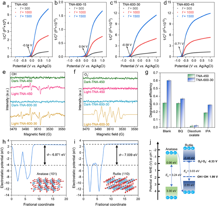 | Fig. 5. Mott-schottky curve based on (a) TNA-450, (b) TNA-600–15, (c) TNA-600–30 and (d) TNA-600–45. Work function of (e) Anatase (101) crystal facet and (f) Rutile (110) crystal facet. (g) Effect of different scavengers on SMR degradation. (h) •OH ESR spectra of TNAs. (i) •O2− ESR spectra of TNAs. (j) Band plot of hetero-phase homojunction TNAs. | |