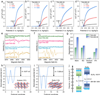 The separation and recombination of photogenerated electron-hole pairs (e− h+) in the semiconductor were analyzed through EIS, transient photocurrent measurements, and LSV tests (Fig. S6 in Supporting information). The Nyquist plots of TNA-450 and TNA-600 are shown in Fig. 3a. The Nyquist impedance spectra reflect the charge transfer resistance at the catalyst surface and the interface, with the semicircle radius corresponding to the rate of photocatalytic reactions occurring at the surface. A smaller radius indicates lower surface charge transfer resistance, leading to faster separation and transfer of photogenerated electron-hole pairs. Overall, TNA-600 exhibited lower charge transfer resistance compared to TNA-450, with TNA-600–30 showing the smallest resistance, indicating that the introduction of the rutile phase effectively promotes the separation of photogenerated carriers. As shown in Figs. 3b and c, TNA-600–30 exhibited the highest photocurrent density, and all TNA-600 samples showed higher photocurrent densities than TNA-450, demonstrating that the hetero-phase homojunction of anatase and rutile effectively enhances carrier transfer. The carrier concentration was calculated as shown in Fig. S10 (Supporting information). Given that the anatase phase exhibits superior photocatalytic activity compared to the rutile phase, the carrier concentration was observed to decrease with the reduction in the anatase phase ratio. However, the high carrier separation efficiency of TNA-600–30 promoted the migration of a greater number of carriers to the interface, which consequently led to a significantly improved photocurrent response.
