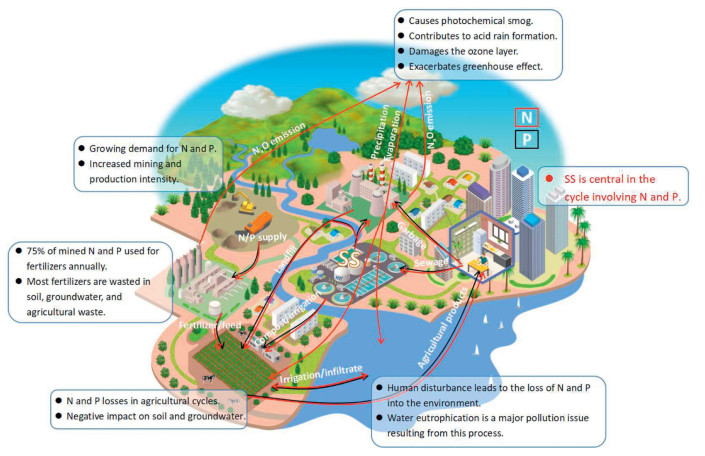 In addition to proper SS treatment, consideration should be given to the environmental benefits of pollution reduction and the economic benefits of resource utilization. N and P are essential nutrients for living organisms, sustaining all life on Earth [14,15]. P regulates algal growth and plankton species distribution by limiting biological subsets in the ecosystem [16,17]. Furthermore, N provides raw materials for industrial production, fertilizers for agriculture and aquaculture, and food and energy for households [18,19]. P is used in industrial ores, animal feed, and as a fertilizer for crops [17]. Rapid urbanization and excessive human disturbance have greatly promoted the flow of N and P from the socio-economic system to the ecological environment, accelerating the N and P cycles [20]. Fig. 1 illustrates the N and P cycles in human production activities. Therefore, reducing the flow of N and P from SS into the ecological environment has become a focus for sustainable resource management and a circular economy.