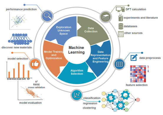 Data collection forms the foundation of the ML process, where the data quality directly impacts model accuracy. For a defined objective, data is sourced from experiments, computational models, simulations, and established databases such as Materials Project (MP), Crystallography Open Database (COD), and Inorganic Crystal Structure Database (ICSD) (Table 1) [29-51]. Published literature is another valuable data source, however, manual extraction is time-consuming. The integration of natural language processing (NLP) technology, powered by ML, has significantly accelerated this process, enabling efficient analysis of large volumes of text and extraction of relevant chemical information [52-59].