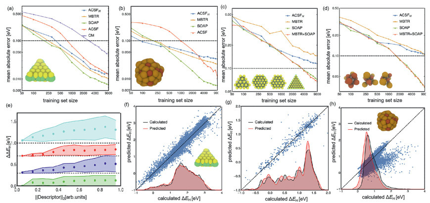 | Fig. 3. Study of hydrogen adsorption on nanoclusters through machine learning using structural descriptors. (a–d) Learning curves for different datasets showing the MAE for different training set sizes. Descriptors CM, SOAP, MBTR, and ACSF were used as features in KRR to predict ΔEH. The following datasets were used: (a) MoS2 (single), (b) Au40Cu40 (single), (c) MoS2 (multiple), (d) AuCu (multiple). (e) Mean of data point pairs on the axes of Δ(ΔEH) and (dis) similarity defined by d = ||Descriptor||2 within bins of size 0.1. The colored area highlights the standard deviation in those bins. The data set MoS2(multi) was used to compare the descriptors CM (cyan, offset 1.0 eV), SOAP (red, offset 0.7 eV), MBTR (blue, offset 0.3 eV) and ACSF (green). (f–h) Parity plots of predicted versus calculated ΔEH for different training and testing sets, along with histograms of the predicted (red) and calculated (black) energy distributions. (f) The data set of multiple clusters MoS2 (multi) was used as a training set and the data set MoS2 (single) cluster was used as the displayed test set. (g) The data set of multiple clusters MoS2(multi) was used as a training set and a data set of local minima on frozen clusters was used as the displayed test set. (h) The data set of multiple clusters AuCu(multi) was used as a training set and the data set Au40Cu40(single) cluster was used as the displayed test set. Reproduced with permission [73]. Copyright 2018, Springer Nature. | |