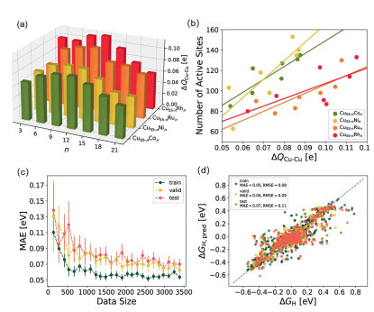 | Fig. 5. Study on screening alloy nanoclusters for electrocatalytic hydrogen evolution. Descriptors used for evaluating HER performance: (a) The average charge difference ΔQCu-Cu between two adjacent Cu atoms on the edge site and vertical site for Cu55-nMn (M = Co, Ni, Ru, and Rh) alloy clusters; (b) linear relationship between the number of active sites (|ΔGH*| < 0.15 eV) and the average charge difference ΔQCu-Cu. Machine learning predictions: (c) Learning curve of the neural network, (d) parity plot between predicted values and DFT calculated ΔGH* values. Reproduced with permission [75]. Copyright 2021, Springer Nature. | |