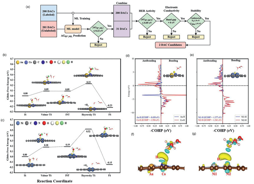 As computational capabilities improve, high-throughput computing combined with ML has increasingly become central to the research of DACs. Boonpalit et al. [100] innovatively applied the CGCNN model, to screen 435 dual-atom combinations on a nitrogen-doped graphene (N6Gr) substrate, finally identifying AuCo@N6Gr and NiNi@N6Gr as highly efficient catalysts for HER. As shown in the workflow of Fig. 7a, the synergistic strategy combining ML and DFT significantly enhances the efficiency of discovering candidate materials. The screened AuCo and NiNi catalysts exhibited nearly ideal ΔGH* values (about 0 eV) along with exceptional stability and robust electronic performance. Subsequent DFT and electronic structure analyses highlighted that the metal synergistic interaction between Au and Co helps mitigate overly strong hydrogen binding, while the NiNi combination enhances hydrogen binding strength through dual-atom synergy. COHP analysis and charge density difference maps both confirm the significant synergistic effect between these bimetallic sites (Figs. 7b–g). These findings show the potential of ML to rapidly identify promising DAC configurations and advance the development of efficient and stable catalysts for HER. Subsequently, Wei et al. [101] comprehensively considered from multiple dimensions, using an ensemble learning method to construct the ML framework based on graph neural network (GNN) to identify the active sites of DACs. They employed RF model to predict free energies, used SVR deeply understands how atoms and structures affect hydrogen bonding behavior, and employed ANN to predict binding energies. This method ensured high accuracy while reducing computational costs. Their research demonstrates the immense potential of an integrated ML-driven strategy combined with DFT computations in material design and optimizing DAC configurations. In the case of few input features, Wang et al. [102] employed an ANN model, based on DL algorithms, to screen from 406 transition metal (TM) DACs. They identified FeZn and VFe as two DACs with excellent acidic HER performance. This study also verified that the ANN model could accurately predict the HER activity of DACs using simple input features.