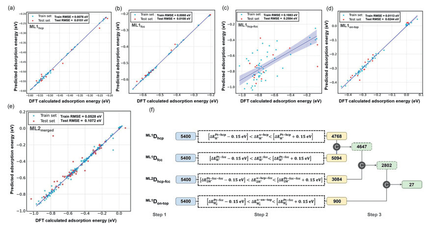 For other ternary alloys, Pandit et al. [111] simulated various compositions of NiCoCu alloys and used an eXtreme Gradient Boosting Regression (XGBR) ML model to predict and identify the best HER catalysts as alternatives to Pt electrodes. Figs. 8a–d show the ML model’s predictions of adsorption energies for different adsorption sites (hcp, fcc, hcp-fcc, and on-top), which are in high agreement with DFT-calculated values, demonstrated the reliability of the model. Fig. 8e further indicated that the optimized and dataset-integrated XGBR model significantly reduces prediction errors. Subsequently, based on this model, they performed high-throughput screening of 5400 candidate alloy structures, ultimately identifying 27 cost-effective alloys as potential substitutes for Pt (Fig. 8f). This ML-DFT strategy not only provides a novel approach for developing low-cost HER catalysts, but also highlights the potential of ML in discovering new and efficient catalysts. In the recent research, Liu et al. [112] used gradient boosting trees (GBT) ML model combined with SHAP method to analyze and predict the impact of different nanoparticle sizes on the catalytic HER performance of nanoalloys. By examining the interactions between metal and support and the exposure ratio of active sites, they determined that the optimal catalyst particle size ranges from 1.5 nm to 3.0 nm. Specifically, the 2.0 nm PtCoNi catalyst achieved excellent catalytic performance with a lower noble metal content than commercial Pt/C catalysts. This study successfully guided the design and optimization of the PtCoNi alloy catalysts through a data-driven approach, validated the significant impact of particle size on catalytic performance, and corroborated the data analysis results with experimental methods.