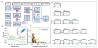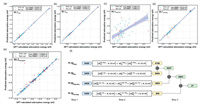 | Fig. 8. Optimizing NiCoCu-based catalysts using DFT and supervised ML techniques. Plots of DFT calculated adsorption energies (ΔEcalc) versus predicted adsorption energies (ΔEpred) with their respective indicated Test and Train RMSE values for (a) one H* atom adsorption at hollow hcp site with optimized XGBR model, (b) one H* atom adsorption at hollow fcc site with optimized XGBR model, (c) two H* atoms adsorptions at both, hollow hcp-fcc site with optimized SVR model, and (d) one H2* molecule adsorption at on-top site with optimized XGBR model. ML1 represents method 1 by considering individual data sets. (e) Plot of DFT calculated adsorption energies (ΔEcalc) versus predicted adsorption energies (ΔEpred) with its indicated test and train RMSE values for merged four data sets with optimized XGBR model. ML2 represents method 2 by considering merged data sets. (f) Flowchart of the performed screening and selection procedure. Dhcp, Dfcc, and Don-top data sets of 5400 were predicted by ML1 methods, and the Dhcp-fcc data set was predicted by the ML2 method. Reproduced with permission [111]. Copyright 2022, American Chemical Society. | |