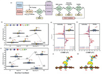 | Fig. 7. Research on graphene-based HER DACs based on CGCNN and DFT. (a) Schematic representing the combined ML and DFT screening workflow. Reaction-free energy profile of HER, including explicit waters on (b) AuCo (c) NiNi, and the corresponding intermediate and transition state structures. (d, e) Projected crystal orbital Hamilton populations (pCOHP) and the corresponding integrated COHP (ICOHP) of AuCo and NiNi between metal atoms and hydrogen atoms during hydrogen binding in explicit solvent environment (right) bonding contribution and (left) antibonding contribution. (f, g) Charge density difference plot of AuCo and NiNi during hydrogen binding, (yellow) charge accumulation, and (blue) charge depletion. Reproduced with permission [100]. Copyright 2023, American Chemical Society. | |