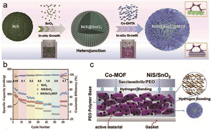 | Fig. 1. (a) Schematic illustration of the synthetic route of NSM composite. (b) Rate performance of SnO2, NiS/SnO2, and NiS/SnO2/MOF electrodes. (c) The schematic diagram of the interior structure in flexible electrode. Reproduced with permission [8]. Copyright 2023, Wiley. | |