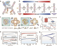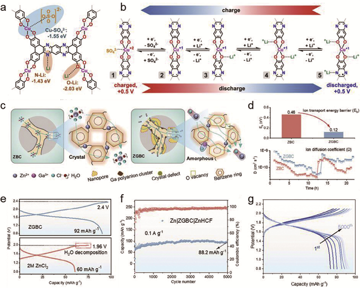 | Fig. 2. (a) Possible active sites for the adsorption of electrolyte cations (Li+) and anions (SO42-) in a single repeating unit of Cu-OHDDQP. (b) Proposed energy storage mechanism for the Cu-OHDDQP electrode in aqueous Li2SO4 electrolyte. Reproduced with permission [10]. Copyright 2025, Wiley. (c) Transport schematic of Zn-ion groups in ZBC and ZGBC electrolytes. (d) Ion transport energy barrier and ion diffusion coefficient of ZBC and ZGBC electrolytes. (e) The charge and discharge curves with different charging voltage. (f, g) The long-term cycling performance and charge and discharge curves of Zn|ZGBC|ZnHCF full cell, running at 0.1 A/g and room temperature. Reproduced with permission [12]. Copyright 2025, Wiley. | |