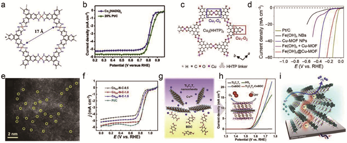 | Fig. 3. (a) Crystal structure and (b) electrocatalytic ORR activity of Co3(HADQ)2. Reproduced with permission [21]. Copyright 2022, Elsevier. (c) Crystal structure and (d) electrocatalytic HER activity of Cu–HHTP. Reproduced with permission [22]. Copyright 2021, AAAS. (e) Atomic-resolution electron microscope images and (f) electrocatalytic ORR activity of Co-N-C catalyst. Reproduced with permission [25]. Copyright 2025, Elsevier. (g) Schematic illustration of the MXenes/Co MOF hybrid and (h) its electrocatalytic OER activity. Reproduced with permission [26]. Copyright 2017, American Chemical Society. (i) Schematic illustration of the MOF thin film for HER. Reproduced with permission [27]. Copyright 2019, American Chemical Society. | |