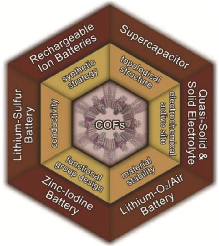 4.1. StatusCOFs are a novel class of organic crystalline materials developed from reticular chemistry concepts based on dynamic covalent chemistry, with the characteristics of long-range order, low density, great stability and high specific surface area [60-62]. COFs have garnered the wide attention in the field of energy storage because of the strong designability of the structure and functionality [63-65]. Despite a development history of <20 years, COFs have demonstrated promising potential for application in the energy storage technologies such as rechargeable metal ion batteries (Li+, Na+, K+, Ca2+, Mg2+, Zn2+, Al3+), Li-air batteries and capacitors (Fig. 6) [66,67]. This paper mainly reviews the recent research progress of COFs in the aforementioned fields.