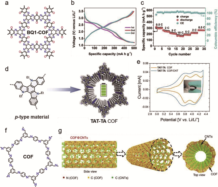 | Fig. 7. COFs as electrode materials of LIBs. (a) Chemical structure of BQ1-COF. (b) The initial three-cycle capacity-voltage profile of BQ1-COF at a current of 0.05 C. (c) Rate capabilities of BQ1-COF at various current rates. Reproduced with permission [73]. Copyright 2020, Elsevier. (d) The azatruxene-based p-type TAT-TA COF and (e) CV curve at 0.2 mV/s of TAT-TA COF/CNT. Reproduced with permission [74]. Copyright 2024, American Chemical Society. (f) Chemical structure of COF and (g) graphical representation of COF@CNTs with few COF layers covered on the exterior surface of CNTs. Reproduced with permission [75]. Copyright 2018, Springer Nature. | |