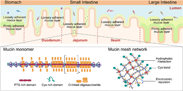 | Fig. 1. Schematic illustration of the distribution and structure of the mucus in the stomach, small intestine, and large intestine. Created in BioRender. com. | |