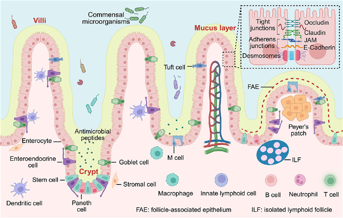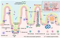 2.2.2. Specialized cells and functions of the epithelial barrierPPs are specialized immune organs located mainly in the ileal region of the small intestine, serving as a crucial defense line against intestinal microorganisms [46]. These patches house a substantial number of immune cells such as T-cells, B-cells, and macrophages, all of which collaborate to maintain intestinal immune homeostasis. Within PPs, M cells play a pivotal role. These cells are unique to PPs and are adept at ingesting and translocating various particles from the gut, such as gut antigens and large proteins. Through this activity, M cells transport these foreign substances to the immune cells within PPs, initiating an immune response that safeguards the organism against pathogens [47,48]. Additionally, a discontinuous type of follicle-associated epithelium (FAE) is found in the small intestine. These epithelial cells, located in mucosal lymphoid follicles, contribute to the synthesis of secretory IgA and have antigen-presenting capabilities. FAEs overlie both PPs and isolated lymphoid follicles (ILFs), which are notable for their low mucus secretion. This characteristic enables them to efficiently pick up antigens directly from the intestinal lumen and convey them to immune cells, enhancing the body’s immune response [46].