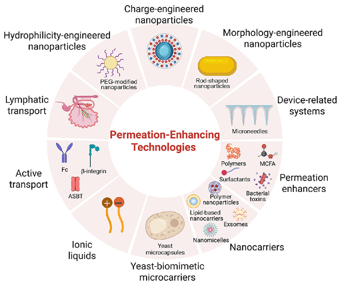 The primary challenges to enhancing the oral bioavailability of peptides stem from their limited ability to penetrate the mucosal layer and their inefficient transport across the intestinal epithelium. To overcome these hurdles, various permeation-enhancing technologies (Fig. 3) have been developed, which are further elaborated upon below.