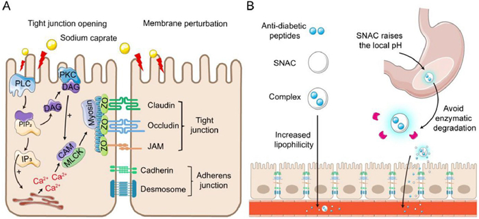 C10, C8, and their derivatives are already utilized in products like oral octreotide and oral semaglutide [25]. C8, typically existing in its ionic form and exhibiting surface-active properties at intestinal pH levels, enhances peptide permeation via both transcellular and paracellular pathways. Transcellular transport depends on interactions with the epithelial membrane, while paracellular transport is mediated by junction proteins. At the molecular level, C8 activates phospholipase C, leading to an increase in inositol triphosphate levels, calcium release, and a rise in intracellular calcium concentration. This results in calmodulin-dependent actomyosin contraction, opening TJs and boosting paracellular transport (Fig. 4A). Additionally, SNAC, identified based on observations that microspheres derived from acylated amino acids enhance peptide absorption [94], is generally recognized as safe (GRAS) status and was initially believed to improve both transcellular and paracellular permeability.