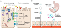 | Fig. 4. The permeation enhancement mechanism of MCFAs and their derivatives. (A) Opening TJs and inducing membrane perturbation to facilitate peptide permeation. (B) Permeation enhancement through the formation of complexes between peptides and SNAC, thereby increasing their lipophilicity (left); and elevating the local pH of peptides to reduce enzymatic degradation (right). Copied with permission [95]. Copyright 2024, The Authors. | |