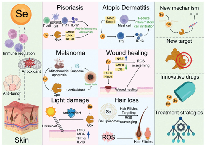2.2. Immune regulation and inflammation inhibitionSe occupies a pivotal position in modulating immune responses and curbing inflammation. By modulating T-cell expansion and specialization, Se helps uphold immune homeostasis [4]. This immunomodulatory effect helps to alleviate the excessive inflammatory response of the skin and alleviate skin disorders caused by oxidative stress.