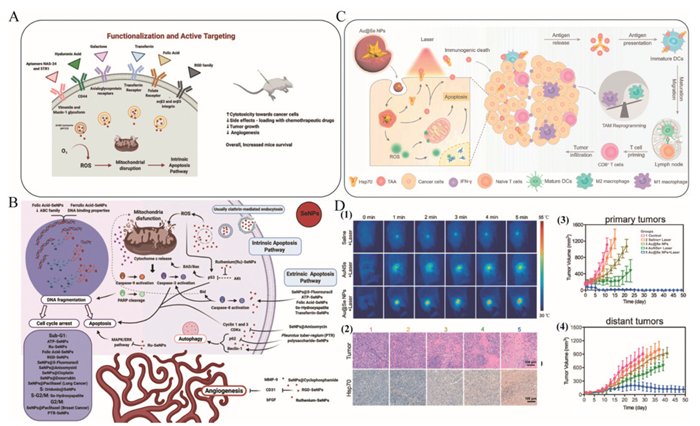 | Fig. 2. Breakthroughs in theranostic applications of SeNPs. (A) Key compounds and their cognate receptors for SeNPs functionalization. (B) Antitumor mechanisms of SeNPs vary depending on surface modification/functionalization strategies and drug-loading properties. Reproduced with permission [19]. Copyright 2021, Wiley-VCH. (C) Nanotherapeutic Au@SeNPs for photothermal-based immunotherapy: Modulating immunosuppressive tumor conditions and activating systemic anticancer responses. (D) Thermal imaging of the Au@Se NPs + PTT group indicated a pronounced rise in tumor temperature (1). Histopathological examination revealed extensive tumor cell apoptosis with prominent Hsp70 expression (2), alongside significant suppression of both the primary (3) and distant tumor growth (4). Reproduced with permission [24]. Copyright 2020, Elsevier Ltd. | |