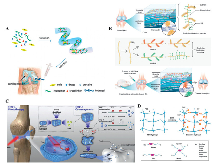 | Fig. 2. (A) Schematic representation illustrating the preparation of a hydrogel delivery system to treat knee OA via IA injection. Copied with permission [14]. Copyright 2017, Elsevier. (B) Illustration of the overall idea. Copied with permission [43]. Copyright 2021, Springer Nature. (C) Schematic illustration of the PRP-CS thermoresponsive hydrogel combined with BPNs as injectable biomaterial for biotherapy and phototherapy treatment of RA. Copied with permission [51]. Copyright 2020, Elsevier. (D) Bioactive modification of PEG hydrogels. Copied with permission [66]. Copyright 2010, Elsevier. | |