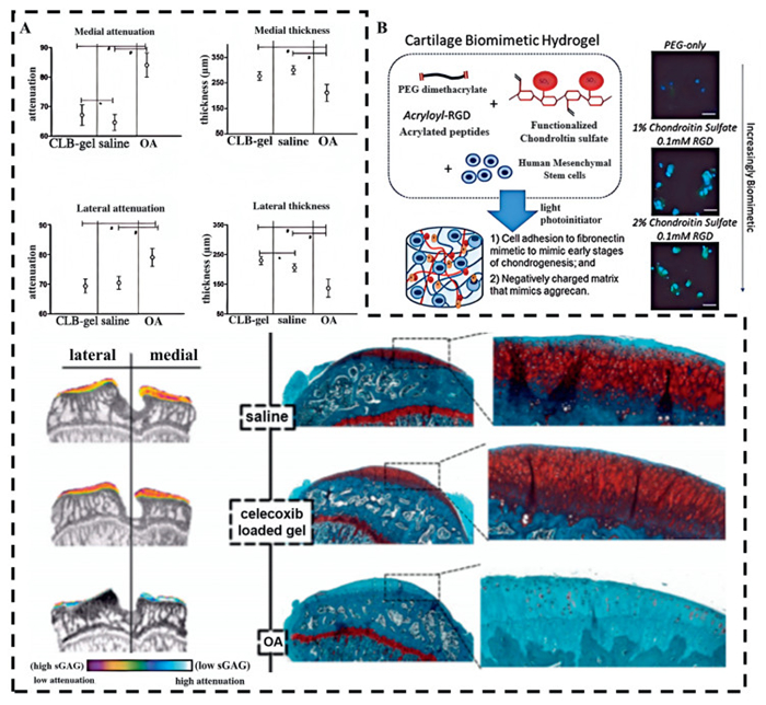 | Fig. 3. (A) IA biocompatibility of celecoxib-loaded gel (50 mg/g, 50 mL). Reproduced with permission [84]. Copyright 2014, Elsevier. (B) An example of a cartilage biomimetic hydrogel. The hydrogel is composed of PEG, chondroitin sulfate (ChS), and a cell adhesion peptide, RGD. Copied with permission [110]. Copyright 2017, Wiley Publishing Group. | |