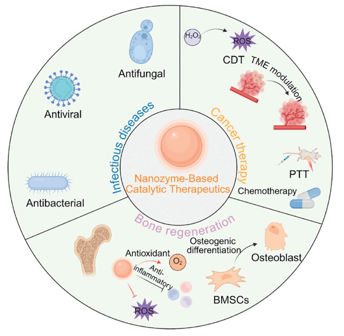 However, despite these promising developments, challenges remain, particularly in achieving controlled catalytic activity in vivo, minimizing off-target effects, and ensuring long-term biosafety. Moreover, as nanozymes advance toward clinical translation, scaling up production, understanding regulatory requirements, and addressing ethical and environmental implications will be critical steps for their therapeutic adoption. In just two decades, the topic of nanozymes development has become a highly transversal field of biomedical research (Fig. S1 in Supporting information). In this review, we summarize the recent progress of nanozyme-based catalytic therapeutics over the past several years, focusing on their mechanisms and biomedical applications in infectious diseases, cancer therapy, and bone regeneration (Fig. 1). We also highlight emerging enzyme-mimetic modalities such as NOS-like activity, discuss standardized evaluation of catalytic kinetics, and examine key barriers to clinical translation, offering insight into the future of this dynamic field.