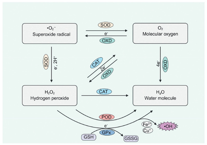 | Fig. 2. Schematic illustration of the catalytic mechanisms of representative oxidoreductases. The diagram depicts the enzymatic pathways mediated by five major oxidoreductases including POD, CAT, OXD, SOD, and GPx, which are involved in the regulation of ROS through both generation and elimination mechanisms. | |