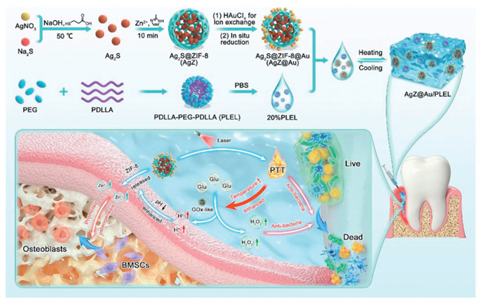 | Fig. 3. A multifunctional AgZ@Au/PLEL hydrogel for antibacterial bone regeneration. The photothermal and catalytic activities enable ROS generation and antibacterial effects, while simultaneously promoting osteogenesis at the bone defect site. Copied with permission [23]. Copyright 2025, Elsevier. | |