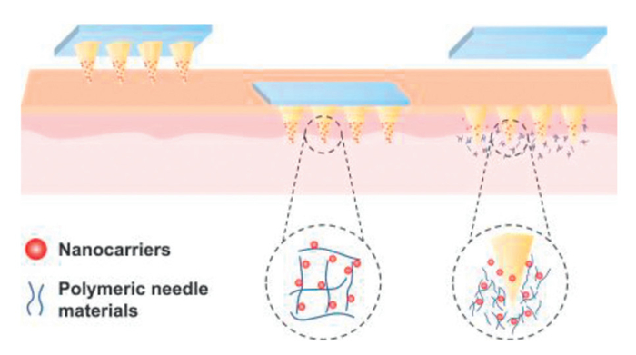 When DMNs load nanocarriers, the interactions between polymeric microneedle matrices and encapsulated nanocarriers critically influence drug degradation and release profiles. Studies have shown that polymer biodegradability and drug release characteristics are essential parameters for effective drug delivery via nanocarriers [68]. Ahmad et al. have employed chitosan to prepare chitosan-DMNs for the sustained release of tacrolimus [69]. Chitosan has good adhesion properties by absorbing water and swelling in the weakly acidic environment of the skin [32]. Compared with other polymeric materials, chitosan has low water solubility [29]. When nanocarriers are encapsulated within chitosan-DMNs, polymer- nanocarrier interactions promote the formation of dense three-dimensional networks at nanocarrier surfaces, physically hindering nanocarriers degradation and consequently delaying drug release.