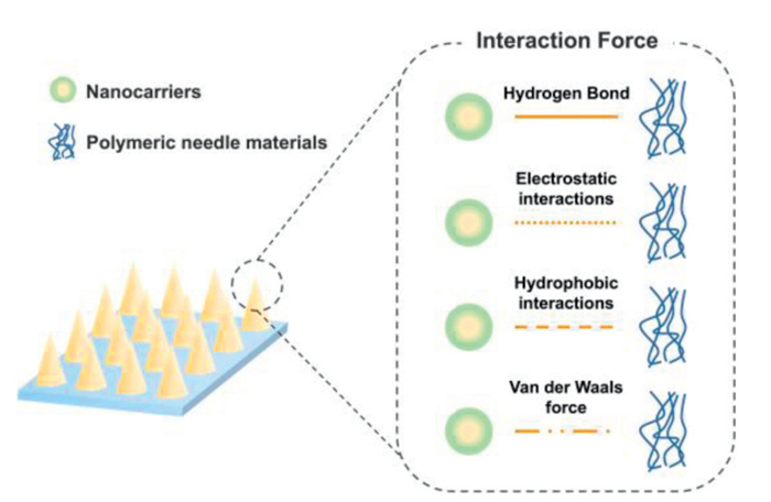 In DMN delivery systems, polymeric materials serve as the primary matrix components for microneedle fabrication [23]. This creates a potential scenario where nanocarriers may interact with the surrounding polymeric materials of DMNs. We define this phenomenon as the PME, wherein DMN polymers may be modified on nanocarrier surfaces during preparation or release processes, consequently altering their intrinsic physicochemical properties (Fig. 1). Current evidence suggests that polymer-nanocarrier interactions in DMN systems are predominantly mediated by non-covalent forces, including electrostatic interactions, hydrogen bonding, and hydrophobic effects [16].
