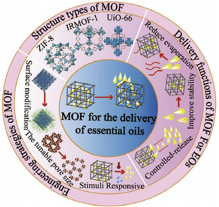 | Fig. 1. Schematic diagram of the structure types of MOF, the delivery functions of MOF for EOs, and the engineering strategies of MOF for delivering EOs. | |