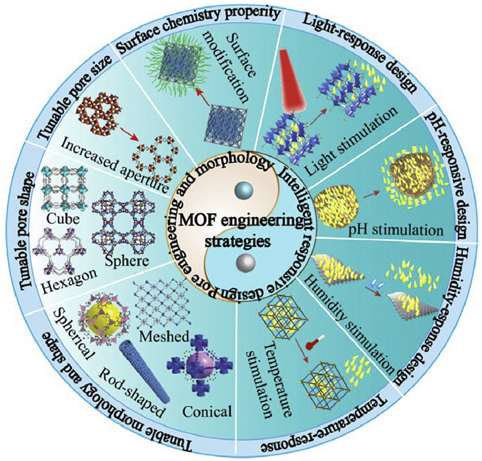 | Fig. 2. The engineering strategies of MOFs including pore engineering (tunable pore size and pore shape), tunable morphology, surface chemical property, and intelligent response design. | |