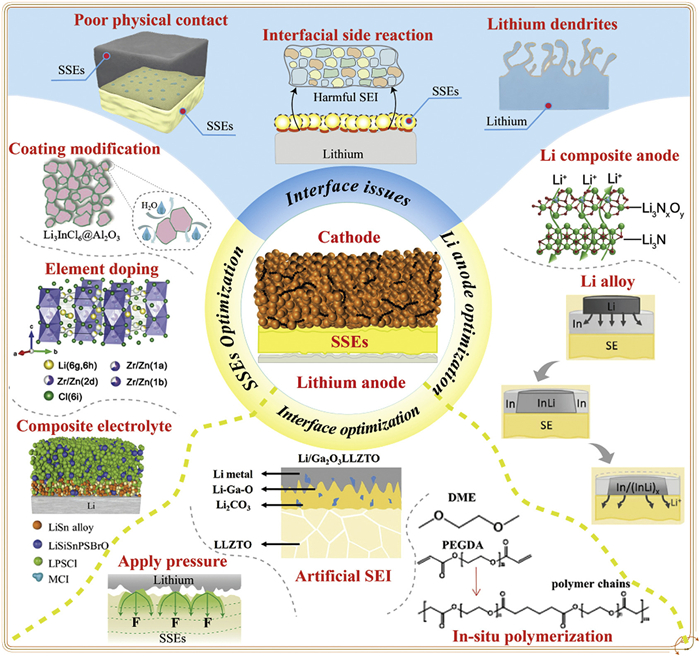 To address interfacial issues between SSEs and LMA, optimization strategies are summarized based on their primary targets: (1) On the SSEs (SSE) side: Optimizing the SSE itself, applying surface coatings, elemental doping optimizations, or compositing different types of SSEs can effectively enhance SSE stability against the LMA and mitigate lithium dendrites issues. (2) At the interface: Applying pressure or employing in situ polymerization technology significantly improves physical contact between the SSE and LMA; designing artificial SEI protective layers effectively isolates side reactions without impeding ion transport. (3) On the LMA side: Adopting lithium alloys or lithium-composite anode strategies reduces anode reactivity, induces uniform lithium deposition, and minimizes the damage to the interface caused by volume changes during the cycling process to the greatest extent.