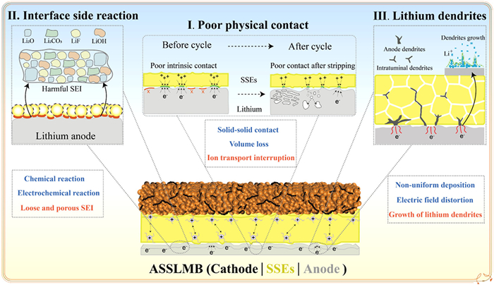 The interfacial issues between SSEs and LMA can be summarized as follows: (1) Poor solid-solid contact: The contact between SSEs and LMA is inherently solid-solid, leading to inadequate physical contact. This directly results in blocked ion transport and reduced energy efficiency. (2) Thermodynamic/electrochemical instability: Thermodynamic instability exists during direct contact between SSEs and LMA, while electrochemical instability occurs during battery operation. These instabilities induce interfacial side reactions, generating harmful phases that accumulate at the interface, thereby increasing interfacial resistance and depleting active materials. (3) Lithium dendrites formation: During electrochemical processes, microscale defects and inhomogeneous local electric fields cause non-uniform lithium deposition, promoting lithium dendrites nucleation and growth at the interface. This ultimately triggers short circuits and thermal runaway risks. These three major interfacial challenges severely restrict the compatibility between SSEs and LMA.