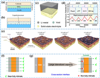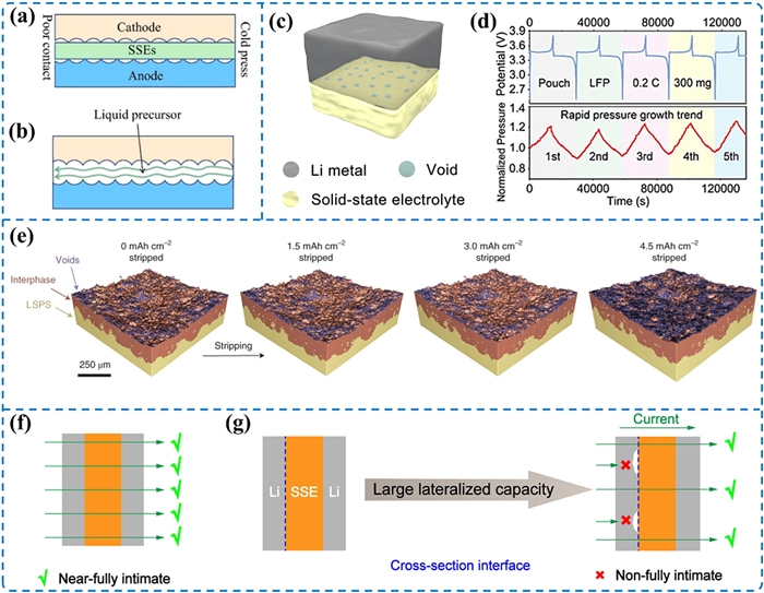 | Fig. 3. (a) Schematic of solid-solid contact at the SSEs/LMA interface. (b) Schematic of solid-liquid infiltration contact between traditional liquid electrolyte and LMA. Reproduced with permission [44]. Copyright 2025, Elsevier. (c) Schematic illustrating interfacial gaps at the SSEs/LMA interface. Reproduced with permission [29]. Copyright 2022, The American Association for the Advancement of Science. (d) Stress evolution curves within LMA pouch cells versus cycle number. Reproduced with permission [46]. Copyright 2024, Wiley-VCH. (e) 3D-reconstructed view of the Li10SnP2S12 interface after cycling at 1 mA/cm2. Reproduced with permission [47]. Copyright 2021, Springer Nature. (f) Schematic of interfacial current density distribution under intimate contact conditions. (g) Schematic showing non-uniform current density distribution due to reduced contact points after cycling. Reproduced with permission [48]. Copyright 2023, Elsevier. | |