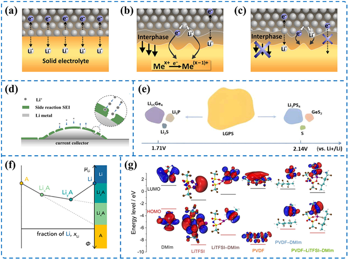| Fig. 4. (a) Schematic of an ideal stable interphase layer between SSEs and LMA. (b) Schematic of a semi-stable interphase layer formation. (c) Schematic of a destabilized interphase layer formation. Reproduced with permission [49]. Copyright 2015, Elsevier. (d) Schematic of unstable SEI formed by side reactions at the SSEs/LMA interface. Reproduced with permission [50]. Copyright 2024, Elsevier. (e) Schematic illustrating detrimental phase generation from side reactions in sulfide SSEs. Reproduced with permission [51]. Copyright 2023, Elsevier. (f) GPPD for lithium. Reproduced with permission [56]. Copyright 2025, American Chemical Society. (g) Electrochemical stability windows of components in solid polymer electrolyte systems. Reproduced with permission [58]. Copyright 2022, Wiley-VCH. | |