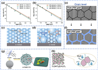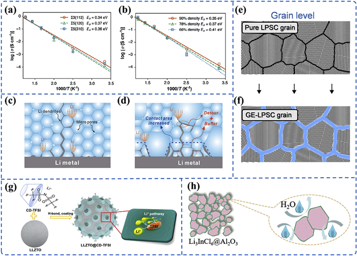 | Fig. 6. (a) Ionic conductivity of lithium ions at the grain boundaries of Li3InCl6. (b) Ionic conductivity of lithium ions within the grain boundaries of Li3InCl6. Reproduced with permission [66]. Copyright 2023, Wiley-VCH. (c) Direct penetration of lithium dendrites through homogeneous LLZO grains. (d) Confined growth of lithium dendrites in LLZO with mixed large/small grains. Reproduced with permission [68]. Copyright 2024, Wiley-VCH. (e) Pristine Li6PS5Cl grains. (f) Core-shell coating layer on Li6PS5Cl grain surfaces. Reproduced with permission [71]. Copyright 2025, Wiley-VCH. (g) Coating optimization of Li6.75La3Zr1.75Ta0.25O12 using functional supramolecules. Reproduced with permission [73]. Copyright 2023, Wiley-VCH. (h) Al2O3 coating on Li3InCl6 particles. Reproduced with permission [31]. Copyright 2021, Wiley-VCH. | |